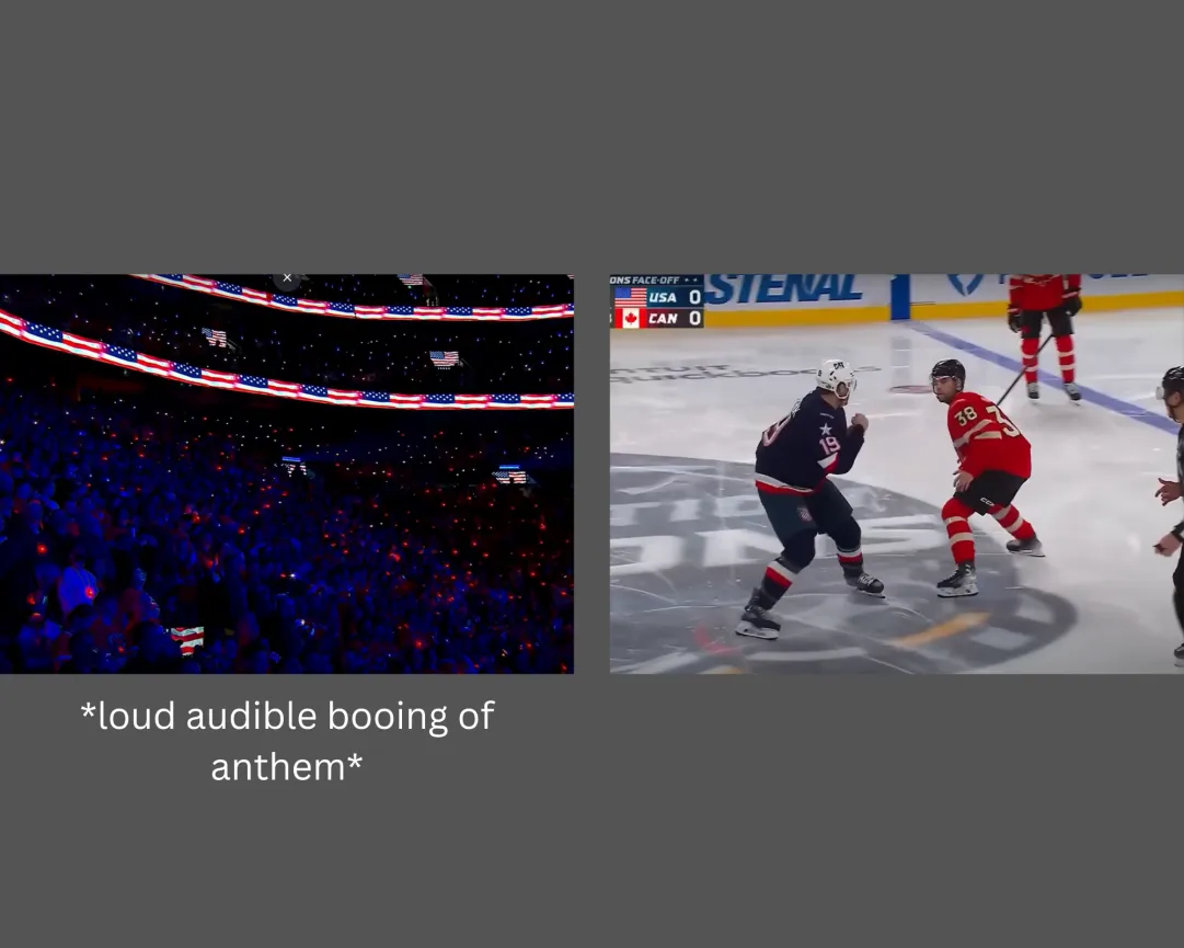 Charged symbols were as inescapable as the inevitably of violence. Wayne Gretzky, the undisputed greatest hockey player of all time and a beloved icon of the game, was Team Canada’s honorary captain. He is more or less the symbol of hockey. His presence is akin to a cameo in a Marvel movie: it gives the viewers (regardless of nationality) what they want, and theoretically makes it harder to boo the anthem to follow (in this case, the Canadian anthem since the game was in Boston). Canada did something similar when the game was in Montreal, though unsuccessful, by having a Canadian military veteran sing the American anthem. Other key symbols include flags all over the stands, a satirically inciting “11th province sign” an eager fan behind one of the benches trying to parade his MAGA hat to the camera, and, on a more somber note, the jersey and family of Johnny Gaudreau, an American NHL superstar tragically killed along with his brother by a drunk driver last summer. Each of these symbols—and others—carry more weight than any viewer can possibly discern or any critic can possibly unpack. This is even more true when they remain unobserved. They provide the context and mental cues for our brains (and emotions) to make sense of the televised sporting event.