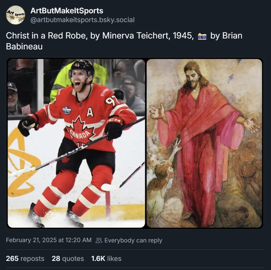 If one wants to take this to its most absurd conclusion, some context on the moment’s hero is needed. McDavid, because of his alienating talent, has jokingly picked up the nickname “McJesus.” That makes this his salvific delivery to Canada. And given the tense and fraught political climate of the two countries, the goal is closer to war heroism than the typical McDavid highlight reel. Trudeau solidified the collective patriotism with his post on X immediately after the victory the goal ensured: “You can't take our country — and you can't take our game.” Popular BlueSky account ArtButMakeItSports exaggerates the heroic imagery and takes it to its extreme conclusion:
