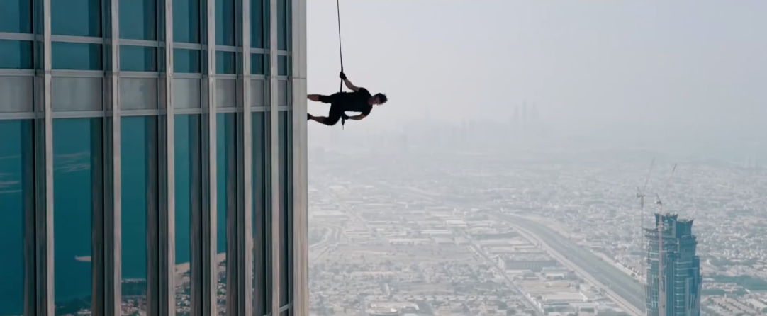 The fourth entry in the Mission Impossible series features one of the most recognizable stunts in action movie history, the Burj Khalifa scene with the real Tom Cruise actually dangling off the world’s tallest building. It’s one of the great scenes of largely analog filmmaking and practical effects in an era dominated by CGI: the world’s biggest movie star risking his life to satiate the audience for nine minutes in IMAX. Of course, this doesn’t mean the scene is free of all computer generated images, but the most important visual elements are real: Tom Cruise and the Burj. It’s a scene of simple wonder. The reflections on the windows capture the movements of the real Dubai: cars, people, and all.