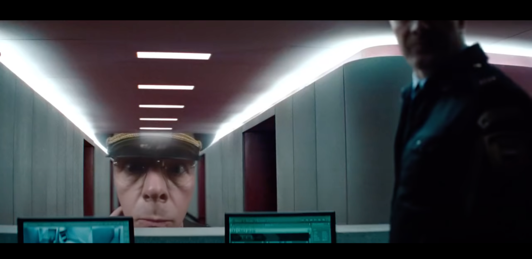 With no exposition required, the Mission Impossible team infiltrates the Kremlin. Ethan Hunt (Cruise) and Benji Dunn (Simon Pegg), in half-hearted disguises and minimal linguistic flexibility, make their way to an intersection of a long hallway with a single guard at the far end. Using in-world gadgets that generate water-droplet sounds in the direction in which they are pointed, Benji distracts the guard and inspires enough curiosity to distract the guard and leave his post ever-so-briefly. Hunt and Benji set up a corridor-wide screen, reflective on one side and translucent on the other. Using a camera that reconstructed the space virtually, they superimpose the reconstructed space onto the reflective or far side of the screen. This allows the two spies to break into the archival room without alarming the guard. A robotic arm on the near side of the screen mimics the eye movement of the guard, allowing for the optical illusion to imitate his perspective point.