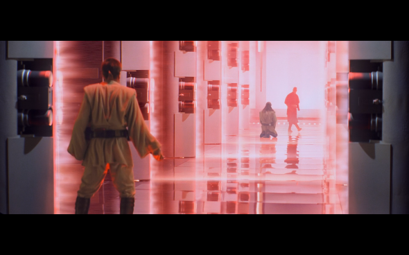 The layered optical philosophy is most impressive: a fictional image is produced by a “real” image which in turn produces a “fake” one that then becomes “real” again through what might be described as a Texas Switch of real and “fake” camera work and effects. The only possible reference shot I’m aware of comes in Star Wars: The Phantom Menace, with the red zone shield generator—which also takes place in a hallway.