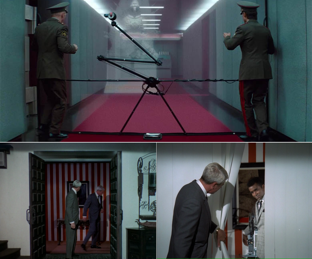The camera illusion itself, even on the surface, depends on a technique as old as Georges Méliès and as such has lost all truly illusory power. The Cruise-Pegg perspectives include the corridor set-up described above, while the Guard perspective shots do not: the hall is empty, other than some composited images that look superimposed. It’s a magic trick that the guild of magicians revealed almost a century prior. The same technique was even employed in a different context for the original television show in the season four episode “The Falcon. Part 3.”