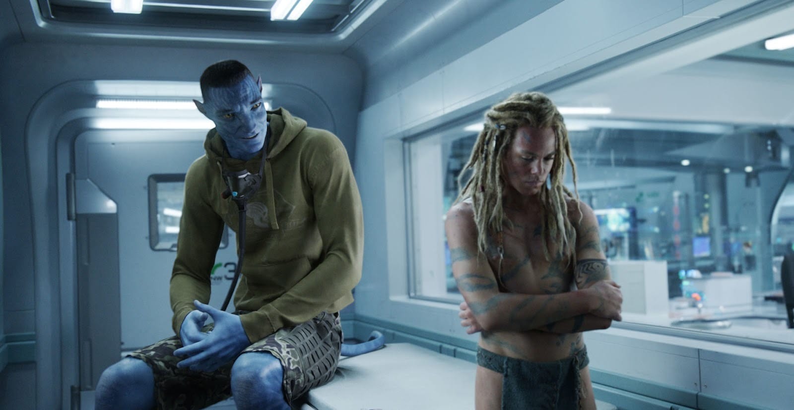 Jake’s family differs from Cameron’s by having sons. The two living Sully boys, Lo’ak and Spider (via adoption), evince the best and worst of their father. Lo’ak grabs hold of his father’s impulsiveness and rebelliousness, and maybe a little of his romanticism, while Spider inherits his loyalty and responsibleness. Jake is a human in a Na’vi body, so Spider’s absorption into the Sully family visually reminds him, us, and Neytiri most of all of the patriarch’s earthly heritage. He wouldn’t fully make sense as a father or as a person without Spider. A clever auditory match edit of Jake and Spider near the end subtly builds continuity between the two. Jake, traversing a human ship with Lo’ak, confirms things are “clear” before Cameron’s team of five editors (including himself) flashes over to Spider repeating the same word to Kiri. He is his father’s son, the edit affirms.